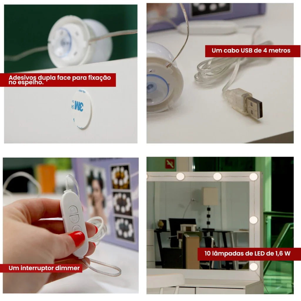 - O cabo USB pode ser ajustado de acordo com a fixação das lâmpadas no espelho.